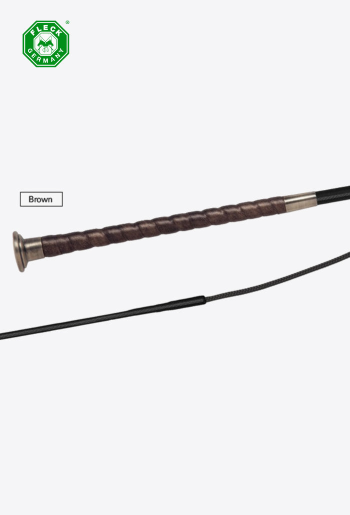 The ELEGANCE dressage whip stands out with its fine nylon weave and refined leather handle. The handle features a stylish mushroom cap and comes in an antique silver or antique brass design for an elegant look.