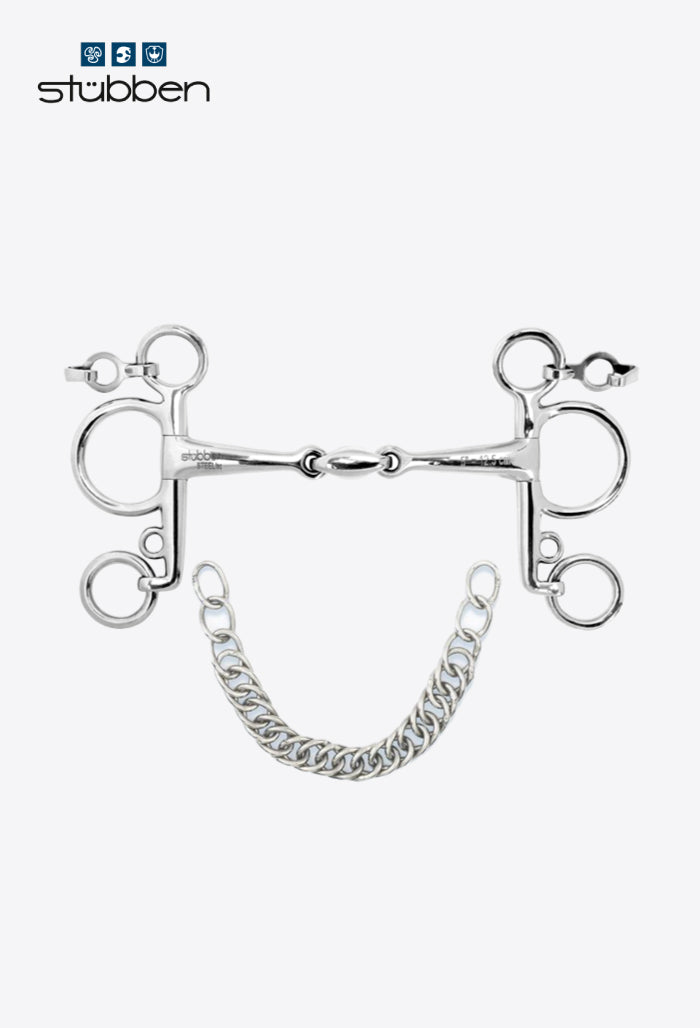 The Baby Pelham provides leverage on the bars, chin, and poll. When the rider tightens the reins, the upper branch moves forward, affecting the poll, while the lower branch tilts backward, applying pressure on the mouth and chin.